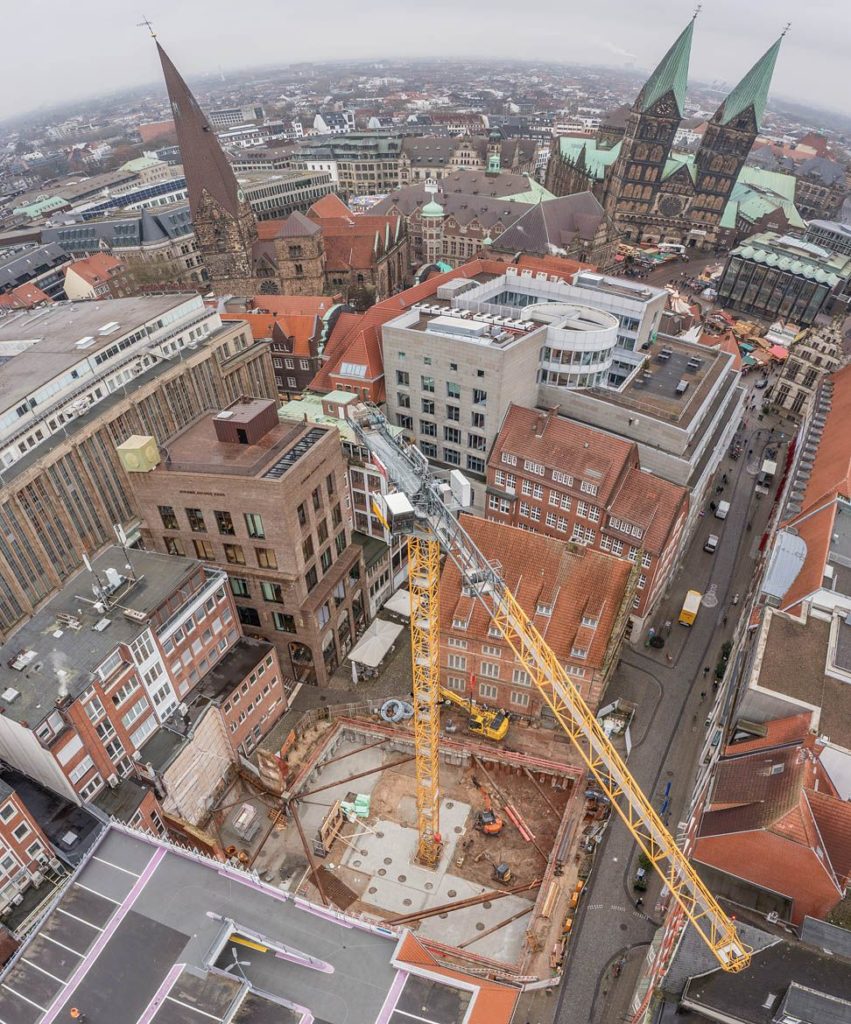Der Hochbau des Neuen Essighauses an der Langenstraße hat begonnen. Alfred Döpker GmbH & Co. KG Bauunternehmen sorgt in dieser Bauphase dafür, dass die Grundstruktur des Gebäudes errichtet wird. Dazu gehören unter anderem das Hochziehen von Wänden, das Errichten von Stützen und Trägern, das Verlegen von Bodenplatten und das Erstellen des Rohbaus für alle Geschosse und Räume.